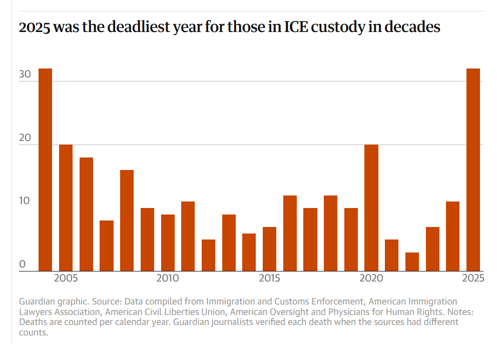 2025 was the deadliest year for those in ICE custody since 2024, per The Guardian. With over 30 deaths and counting…