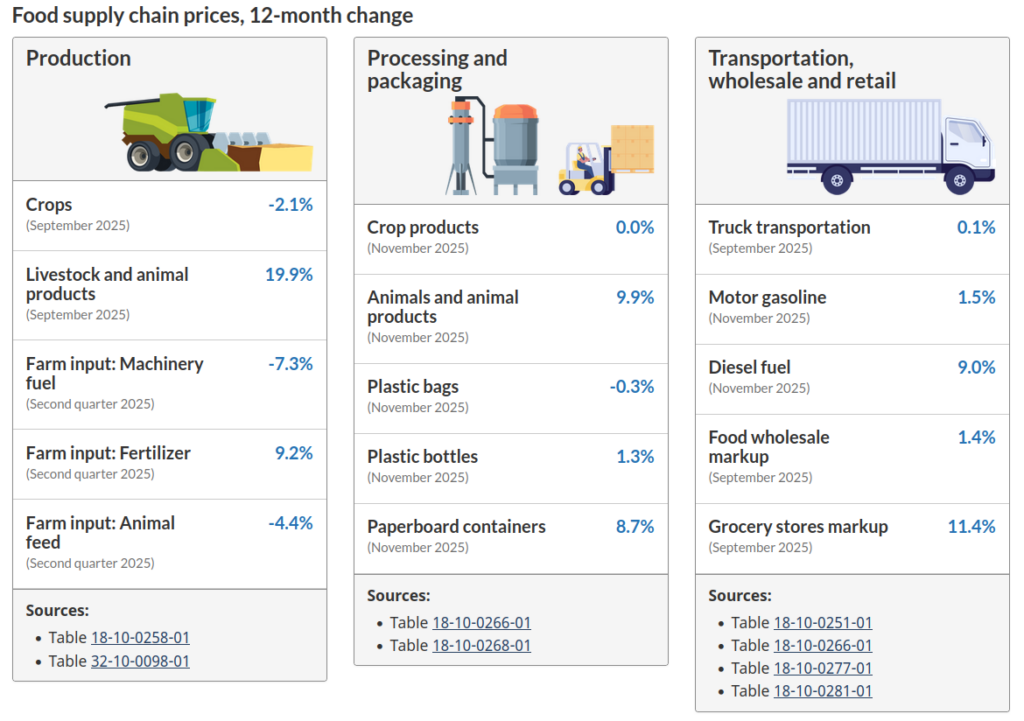 So let’s start with some facts. StatsCan has December 2025 food purchased from stores, in other words your typical grocery bill at 5% inflation, compared the same month of the previous year.